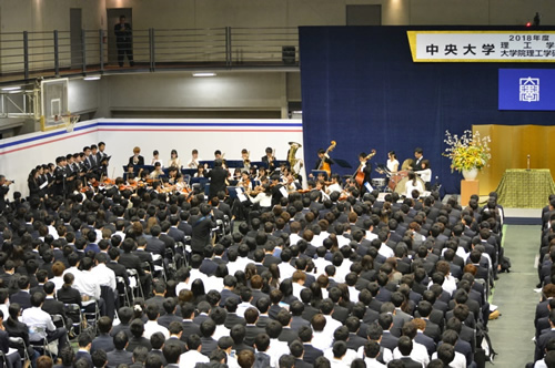 理工学部全体の「理工学部・大学院理工学研究科 入学式」が13:00より5号館アリーナで開催されました。