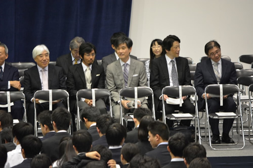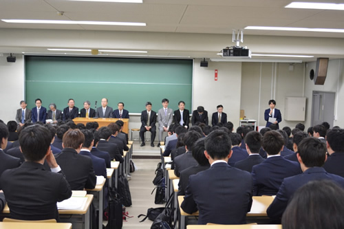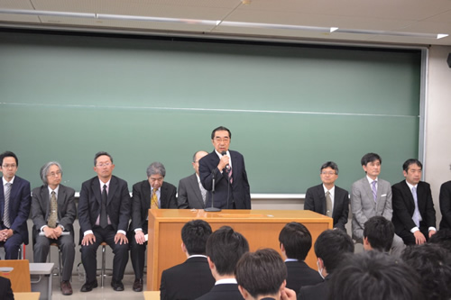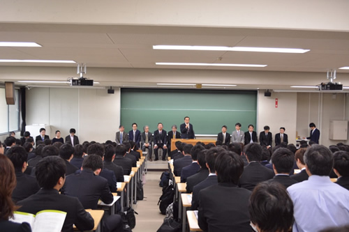 理工学部全体での入学式を終了した後、会場を移動して各学科別の入学式及び学科紹介が執り行われました。同窓会からは飯塚会長より祝辞がありました。